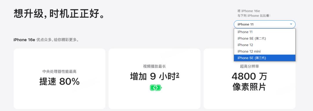 与iPhone相比 16的定价,16e确实便宜了一点,但是砍掉配置却是一大堆。没有高刷,没有灵动岛,没有GPU核心减少,没有相机控制(我支持这个)、无线充电砍半,MagSafe直接砍掉,苹果近几年推出的东西都没有。这个不是买手机啊,这是买个时间机送你去2022年。看看苹果官网的推荐,如果你持有iPhone12 超过Pro的型号,都不值得“升级”。