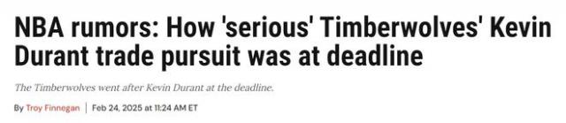 北京时间 2 月 25 日,据名记 Fischer 据报道,森林狼在交易截止日期前非常认真地追求杜兰特,他们与许多团队进行了谈判,以促进杜兰特和爱德华兹的联合。考虑到杜兰特今年夏天可能会被交易,加内特可能会成为当时森林狼的一大帮助,因为他有望加入森林狼管理层,与杜兰特关系良好。