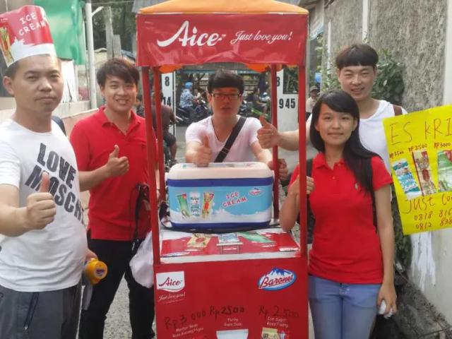 每天,团队成员背靠近接近。 20 公斤泡沫盒,里面装满冰淇淋和冰板,走在大街上,深入农村、街道、学校和公园。他们不会说当地的语言,所以他们在泡沫盒上贴广告和定价。孩子想买什么就买什么。他们还升级了广告模式,用扩音喇叭播放印尼当地人录制的广告,带着自行车和三轮车去学校门口卖冰淇淋。