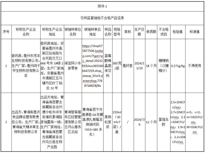 (1)由安徽省亳州市茂丰生物科技有限公司委托安徽省亳州鸿千宇生物科技有限公司生产的蓝莓酸梅晶固体饮料,由淘宝小东家零食(经营者为湖北省襄阳市高新技术开发区汐萌百货、个体户)在淘宝(网店)销售,其中糖精钠(以糖精计)检测值不符合国家食品安全标准。