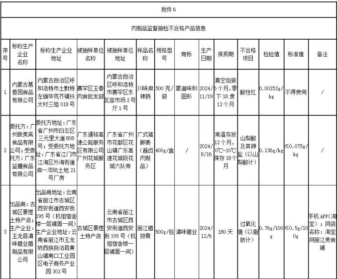 (六)内蒙古自治区呼和浩特市赛罕区玉春肉食批发部销售的川味麻辣香肠,内蒙古慕香园食品有限公司标称,酸性红检测值不符合国家食品安全标准。