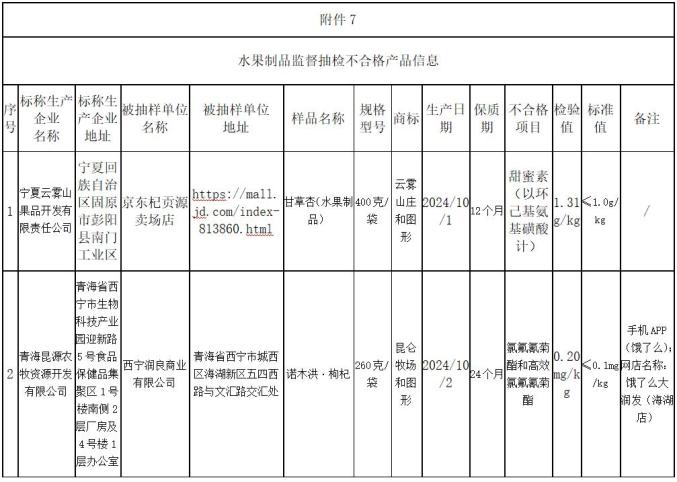 (九)京东杞贡源店(经营者为宁夏玉中贸易有限公司)在JD.COM商城(网店)销售的甘草杏(水果制品),被誉为宁夏云雾山水果开发有限公司,其中甜蜜素(以环己基氨基磺酸计)的检测值不符合国家食品安全标准。