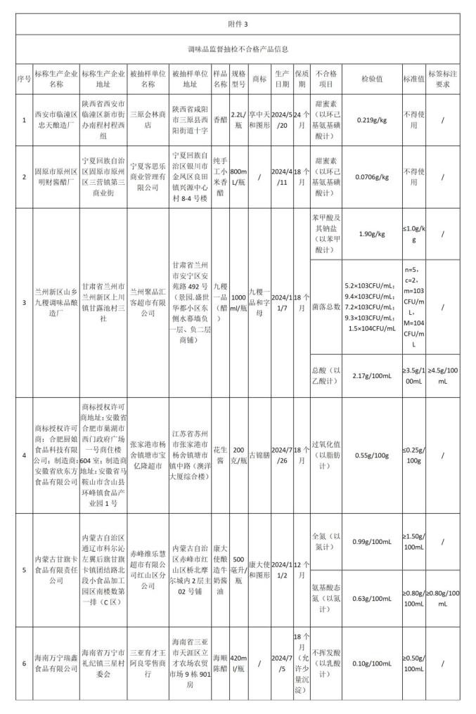 (二)陕西省西安市临潼区忠天酿造厂生产的香醋,由陕西省咸阳市三原会林商店出售,其中甜蜜素(以环己基氨基磺酸计)检测值不符合国家食品安全标准。