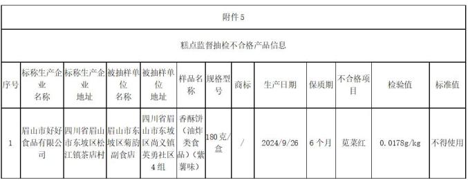 (五)四川省眉山市东坡区菊韵副食店销售的香酥饼(油炸食品)(紫薯味),由四川省眉山市好好食品有限公司标称,其中苋菜红检测值不符合国家食品安全标准。