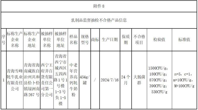 (一)青海西宁王府井百货有限公司第一分公司销售的中老年营养高钙牦牛奶粉,名为青海雪峰牦牛奶业有限公司,其中大肠杆菌数量不符合国家食品安全标准。