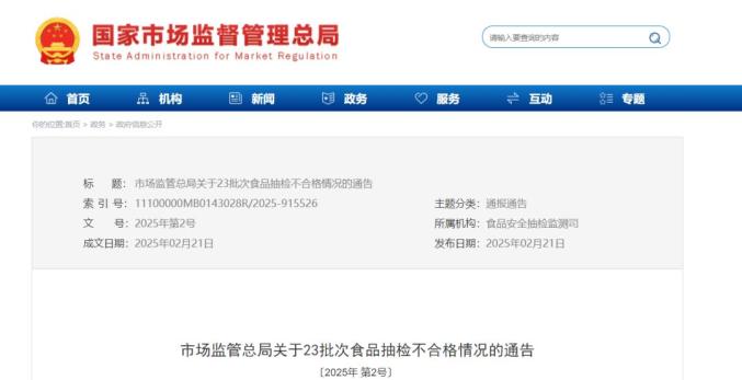 近日,市场监管总局近日组织了1315批食品安全监管抽样样,发现23批样品不合格。相关省市场监管部门已组织对抽样发现的不合格食品进行审查。监督抽样检验不合格食品的具体情况如下: