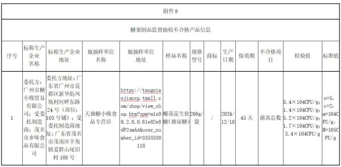 (五)天猫糖小便宜食品加盟店(经营者为广东省广州糖小便宜贸易有限公司)委托广东省茂名乡村风味食品有限公司在天猫商城(网店)销售的椰子花生软糖(猫屎糖),其中菌落总数不符合国家食品安全标准。