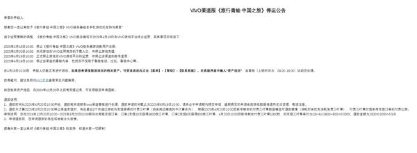 2025 年 4 月 19 日 10:00:游戏正式停止 VIVO 游戏平台的运营,并且停止了该渠道的帐户登录;