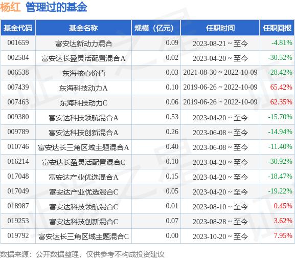 杨红妇女:中国国家,工程硕士。齐鲁证券有限公司研究所通信行业研究员、分析师、第一创业证券股份有限公司资产管理部分析师 ;2013 年 9 每月加入创金合信基金管理有限公司 TMT 研究员,2014 年 7 每月加入东海基金管理有限公司,曾担任公司研发部高级研究员、专户理财部投资经理、研发部负责人、权益投资部副总监、基金经理等职务。2021 年 8 月 30 日至 2022 年 10 月 09 日本是东海核心理念的首选混合型证券投资基金经理。2021 年 8 月 30 日至 2022 年 10 月 09 日本是东海核心理念首选混合型证券投资基金经理。曾任东海科技动力混合型证券投资基金经理。2022 2023年加入富安达基金管理有限公司担任风险控制经理、投资研究基金经理、监督审计部门。 年 4 月 20 日本担任富安达行业首选混合型证券投资基金、富安达长盈灵活配置混合型证券投资基金、富安达科技领先混合型证券投资基金经理。2023 年 6 月 8 日本担任富安达长三角地区主题混合发起型证券基金经理。2023 年 6 月 8 日本担任富安达科技创新混合发起型证券基金经理。2023 年 8 月 21 日本担任富安达新动力灵活配置混合型证券投资基金经理。