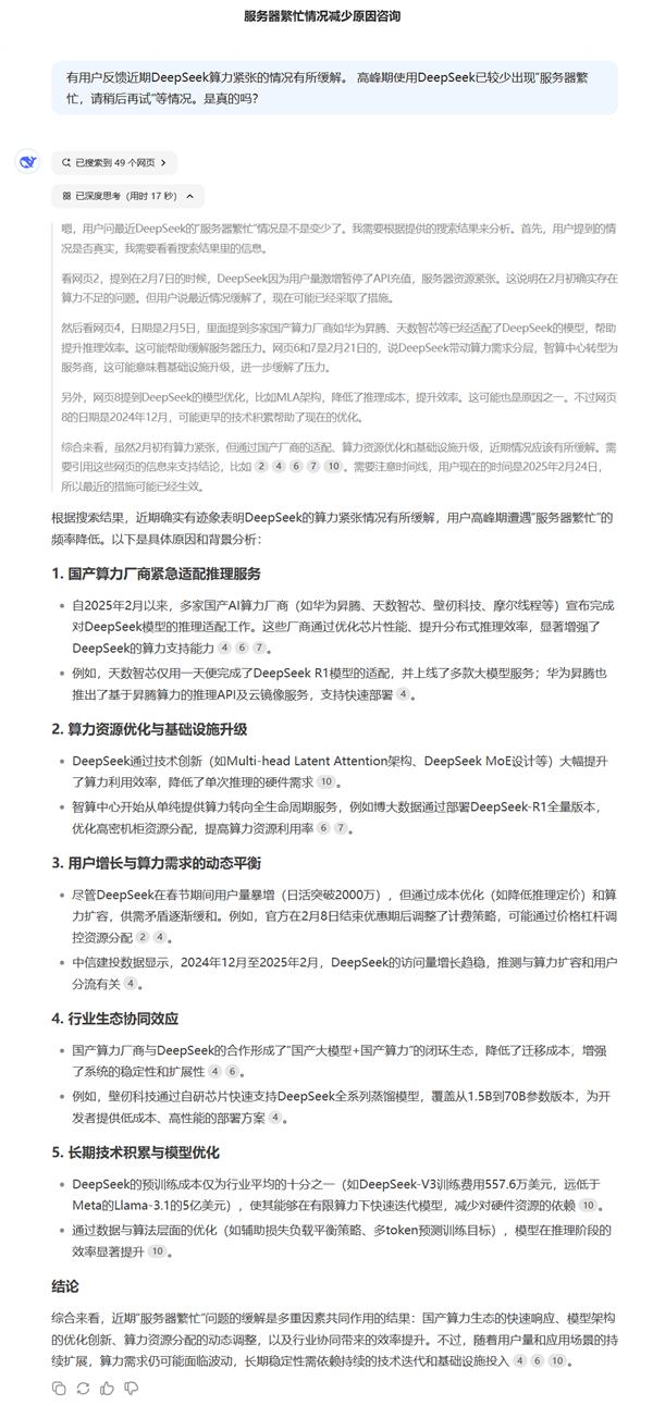 询问这种现象 DeepSeek 答案是:“根据搜索结果,最近确实有迹象表明:” DeepSeek 计算紧张情况有所缓解,客户在高峰时段遭受“服务器繁忙”的次数减少。”