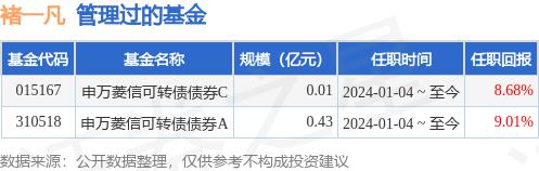 楚一凡先生:中国国家,研究生,硕士。2017 从2019年开始从事金融相关工作,曾在浙商证券有限公司工作,2019年。 年 11 每月加入申万菱信基金,担任基金经理。2024 年 1 月 2 日本担任申万菱信可转换债券型证券投资基金经理。