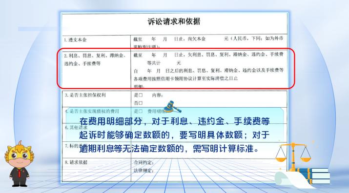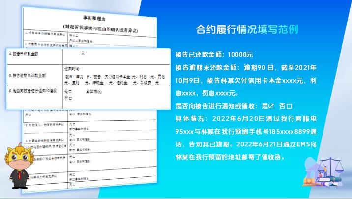 第四,有两个地方需要注意事实和原因。一是准确填写诉讼请求对应的合同依据,包括计算标准、违约情况和信用卡合同中关于利息、违约金等费用的责任协议。二是准确填写合同的履行情况,包括被告的还款金额、逾期还款金额和原告的催款金额。