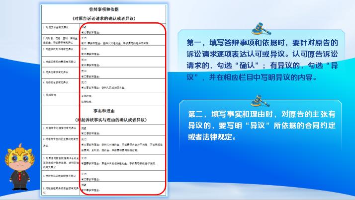 首先,在填写答辩事项和依据时,应逐一表达对原告诉讼请求的认可或质疑。如果你同意原告的诉讼请求,检查“确定”;如有异议,勾选“质疑”,并在相应栏目中注明异议内容。