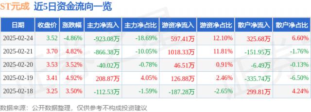 变动快报:2月25日9:42,ST元成(603388)触及跌停板。