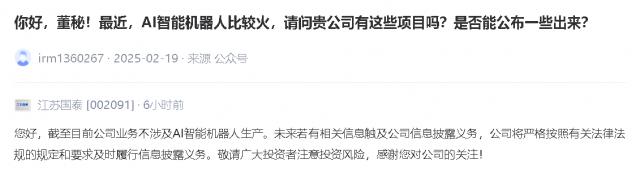 瑞财经 钟鸣辰 2 月 24 日消息,江苏国泰 ( 002091 ) 回复投资者在互动平台上关于“近期,AI 智能化机器人比较火爆,你们公司有这些项目吗?有没有可能公布一些问题?”相关问题。