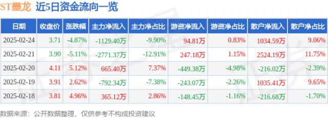 证券之星 2 月 25 日盘消息,9 点 57 分 ST 墨龙(002490)触及日线涨停。当前价格 3.9,上涨 5.12%。该行业的专业设备目前正在下降。新研股份是领涨股。本股为油服、页岩气、山东国企改革理念热股。