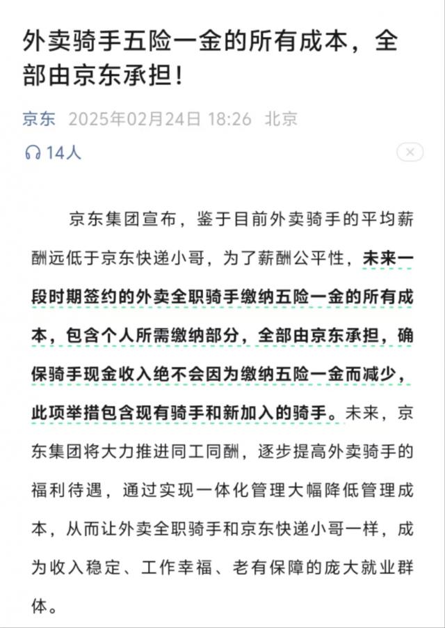 此前,JD.COM正式发布消息,自 2025 年 3 月 1 日起将逐步为京东外卖全职骑手缴纳五险一金,为兼职骑手提供意外险和健康险。