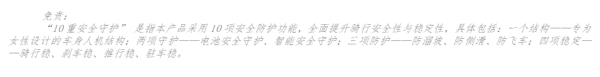 “10重安全保护”是指采用10项安全保护功能,提高骑行安全性和稳定性,主要包括一种结构,专为女性设计车身人体结构,两种保护,电池安全保护和智能安全保护。三种保护包括四种稳定性:防滑坡、防侧滑、防飞车、稳定骑行、稳定刹车、稳定执行和稳定停车。