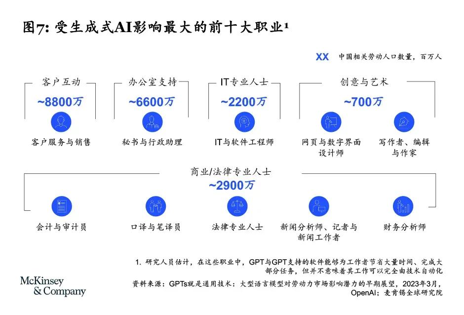 人们曾经认为,这一轮AI冲击波主要影响与文本和视觉设计相关的工人。例如,去年,麦肯锡全球研究院指出,受生成AI影响较大的前十大职业是: