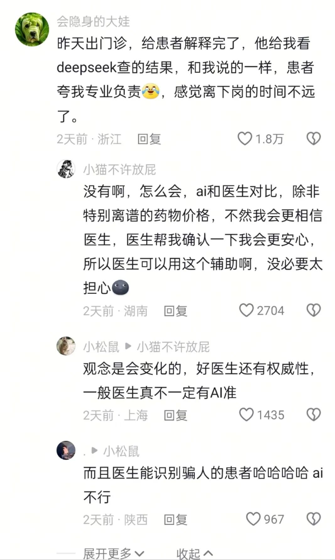 有些病人甚至在看到医生的诊断和DeepSeek的结果一致后,称赞的不是AI强大,而是医生的专业责任。神奇的现象让医生“觉得离失业不远了”。