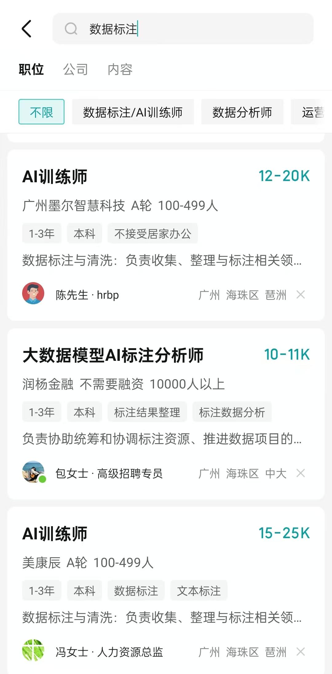 还有进入门槛不高的人工智能训练师,比如,数据标记员,通过收集和处理照片、语音、文本、视频等原始数据,并标注成人工智能可以理解的结构化语言,AI可以训练得更加“聪明”。