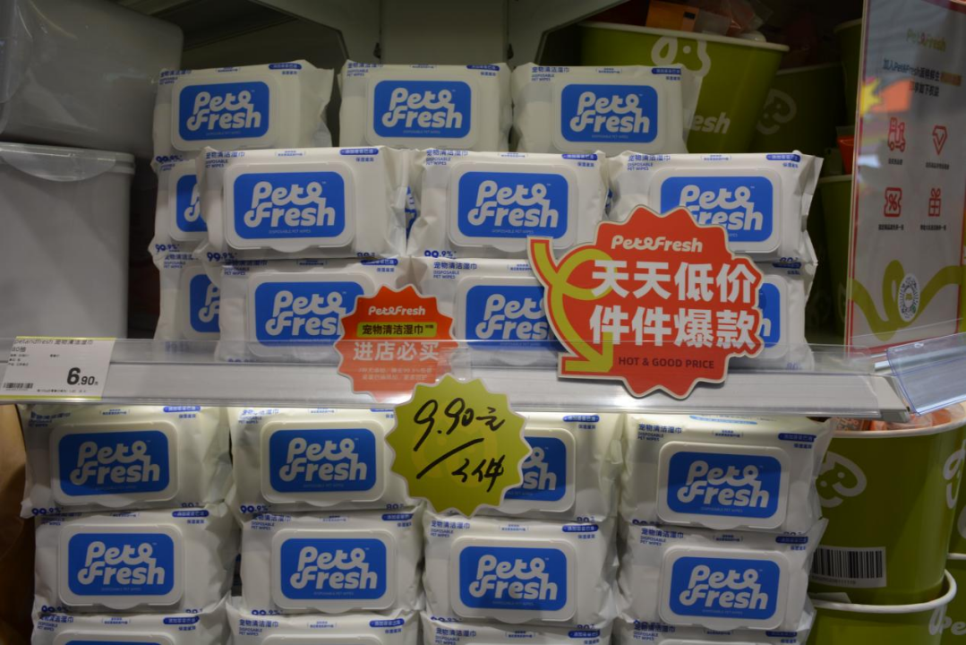 在现场也可以看到,宠物产品真的很实惠。比如9.9元三包宠物湿巾,6.6块进口鸡胸肉罐头,9.9元10条猫条,9.9元2.5KG混合豆腐猫砂等。,并且长期维持这个价格。这种价格机制不仅在线下商店中极具竞争力,而且对在线电子商务也有影响。