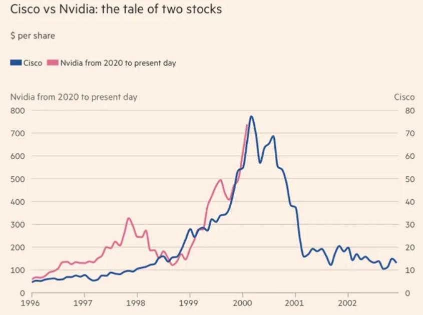 指数增长和市场炒作人工智能和因特网泡沫都经历了投资的迅速涌入,企业估值基于未来的潜力而非实际利润。例如,Nvidia 人工智能领域股价的飙升,反映了互联网时代思科的崛起,两者都被认为是各自繁荣阶段的重要基础设施提供商。