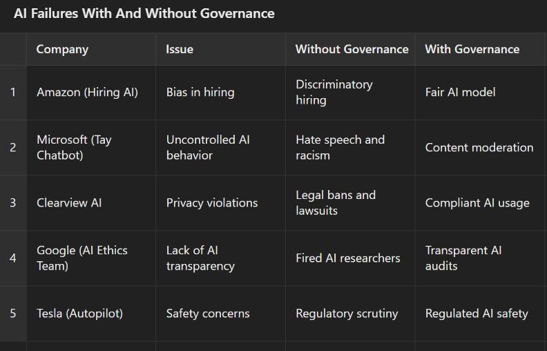 ?例:亚马逊开发了一种人工智能招聘工具,系统地降低了女性候选人的排名,因为培训数据有偏见。如果没有治理,人工智能可能会加剧歧视,而不是消除歧视。
