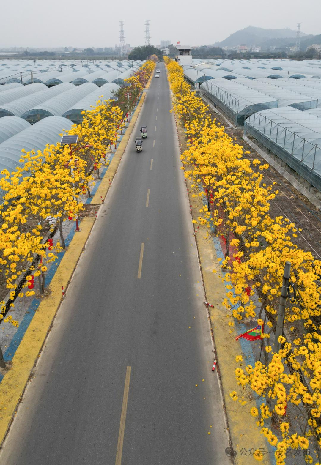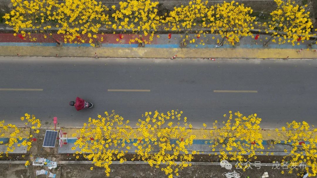 道路两旁黄花风铃木排列整齐。
