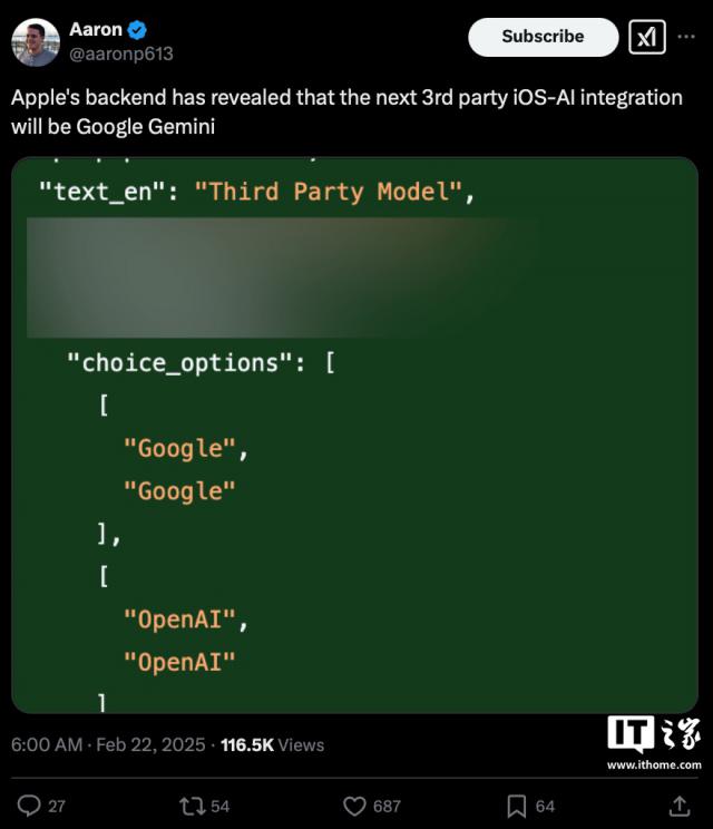 数据挖掘者 Aaron Perris 这个消息是苹果最近发布的。 iOS 18.4 在测试版中注意到相关代码包括对“ Google "和" OpenAI "的引用,与此同时,相应的代码也显示未来 iOS 设置应用的 Apple 在智能化功能中,预计将包括一个“第三方模型”选项,用户可自行选择不同的模型。。
