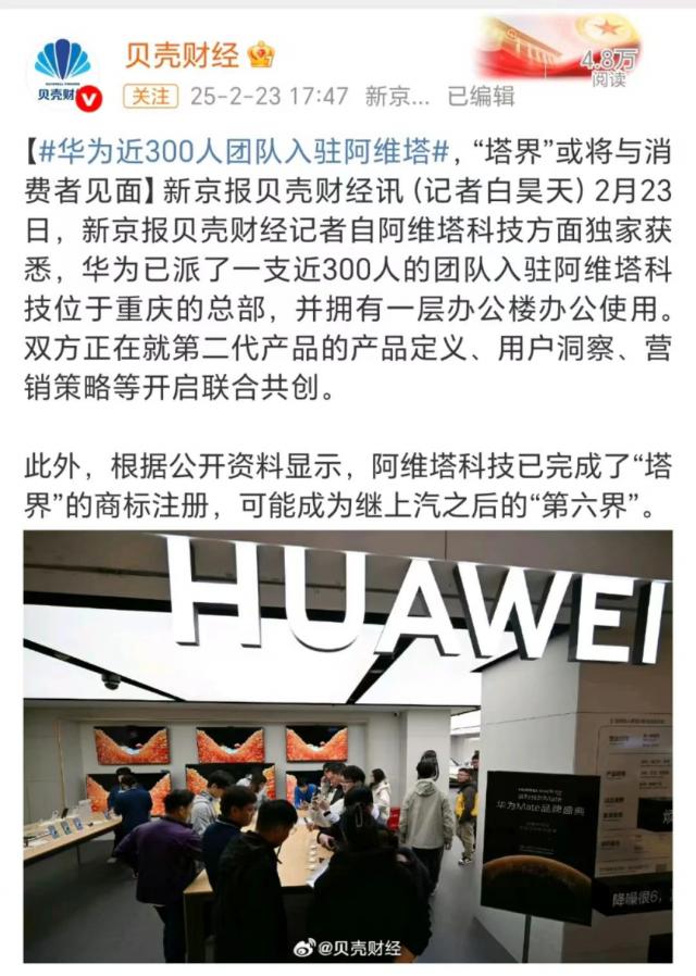 最近,有消息称华为已经派出了一个。 300 阿维塔科技位于重庆总部,双方正在就第二代产品的产品定义、用户洞察力、营销策略等方面进行联合创作。这个动作引起了很大的关注,尤其是今年年初,阿维塔科技申请注册了多个“塔”“势”商标,涉及机械设备、网站服务、科学仪器等国际分类。这个举动被外界解读为华为鸿蒙智行旗下的“下一个世界”即将落地的信号。