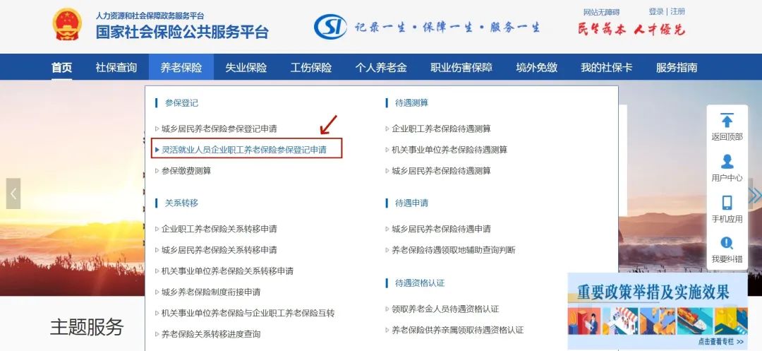 还可以登录国家社会保险公共服务平台(网站:http://si.12333.gov.cn ),点击首页“养老保险”-“参保登记”-“灵活就业人员企业职工养老保险登记申请”,查看办理页面。