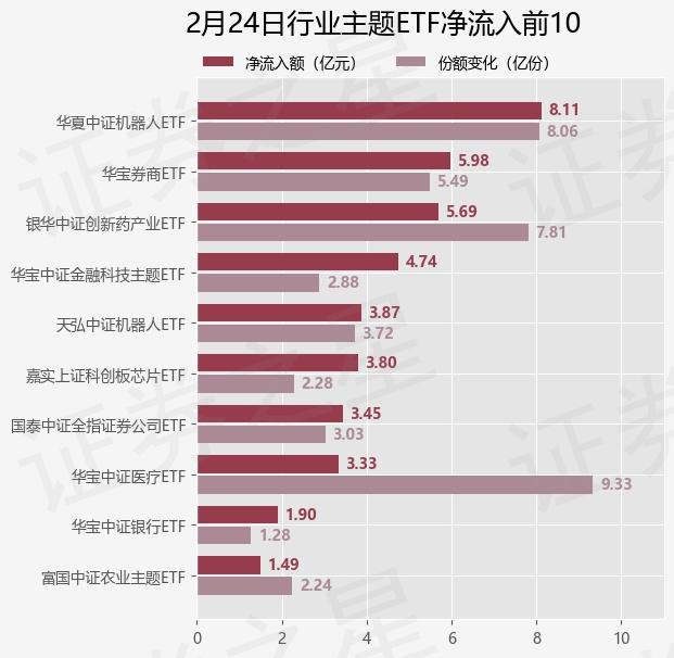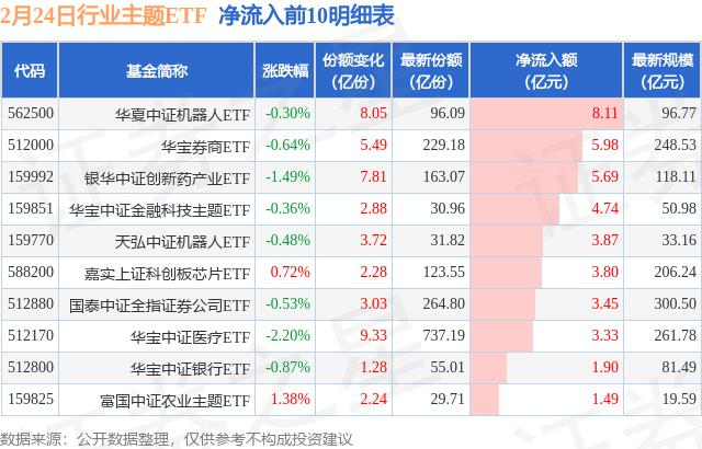 当天有 160 只行业主题 ETF 资金净流入显示,其中华夏中证机器人净流入排名第一。 ETF(562500),份额增加 8.05 十亿份,净流入额为 8.11 亿元。