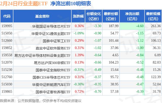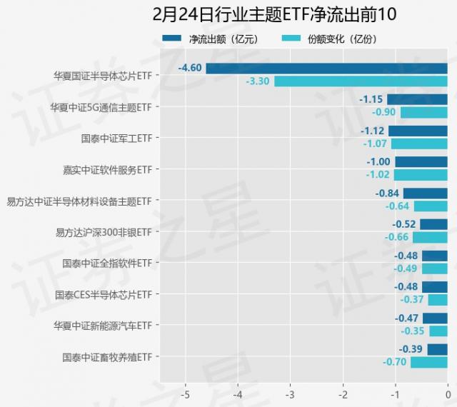当天有 139 只行业主题 ETF 资金净流出,其中华夏国证半导体芯片净流出排名第一。 ETF(159995),份额下降 3.3 一亿份,净流出额为 4.6 亿元。