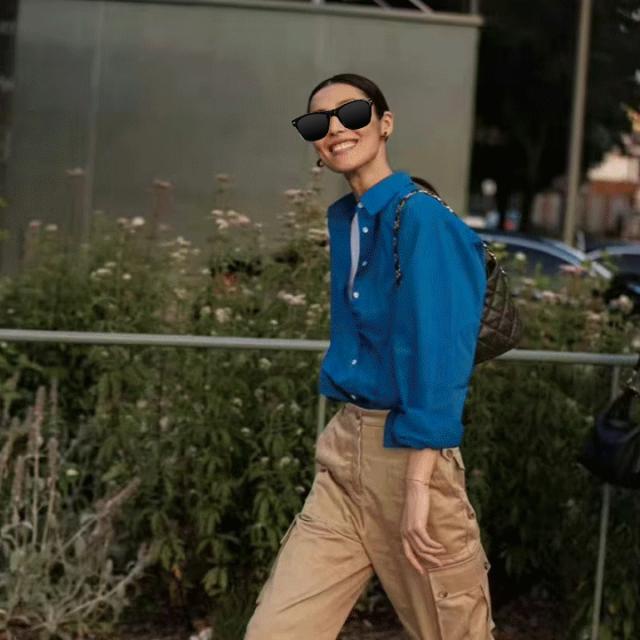超模 * 雯出现在巴黎街拍中,身穿克莱因蓝衬衫配卡其色工装裤,时尚兼顾松弛感,搭配姐系高级感。