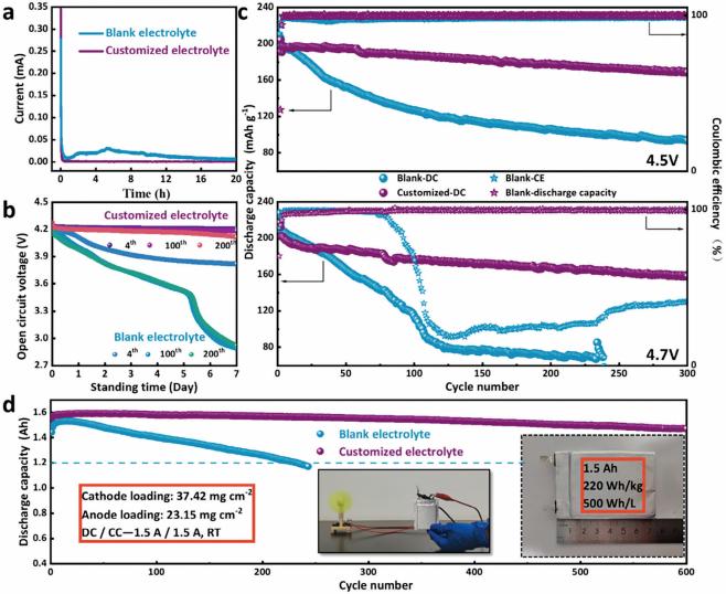 此外,定制电解液的高镍锂电池表现出较小的自放电和较好的高电压稳定性。最引人注目的是1.5 在Ah石墨/NCM811软包电池中,在1C倍数下循环600周后,容量保持率仍然高达94.48%。
