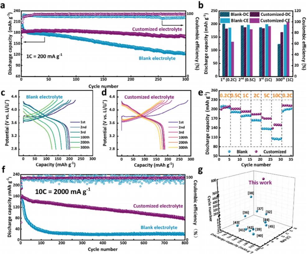 Li/NCM811电池选用定制电解液,电化学性能极佳。NCM811电极在1C倍数下循环300周后仍能发挥1699的作用。 mAh g-1放电比容量,容量维持率高达92.05%。然后通过倍率性能测试发现,定制电解液在每个倍数下都会使NCM811电极具有更高的容量。尤其在10C的超高倍数下,放电比容量仍然可以达到1500。 mAh g-并在800周长循环过程中保持相对稳定,这一优异的性能在目前对大倍数镍锂电池的研究中备受关注。