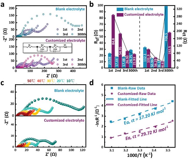 通过EIS测试第1、2、3、300次循环后充电状态的NCM811电极,发现定制电解液中的电极在活性阶段经历了更复杂的界面反应,生成的页面有助于减少电解液在后续循环过程中的分解,进而在长循环后保持较低的界面阻抗和电荷转移阻抗。此外,通过测试不同温度下的电荷转移阻抗,在定制电解液和电极页面上用阿伦尼乌斯公式转换锂离子的溶剂活化能更小,这意味着锂离子更容易在电极电解液界面上脱离溶剂,从而实现高倍率下电极的更快充放电能力。