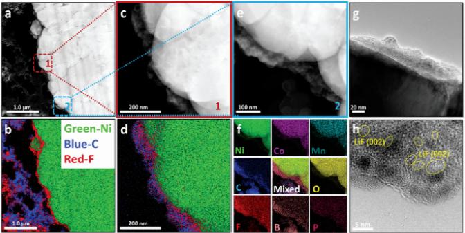 总体而言,由定制电解液衍生的CEI厚度较薄,XPS和TOF-SIMS的结果表明,LiF无机相的比例较高。更加值得注意的是,FIB-TEM可以发现这种CEI具有一定的双层结构,即内层以无机物为主,表层以有机物为主。这种具有双层结构的薄CEI层无疑促进了稳定快速的电荷传输。另一方面,具有高机械强度的内无机LiF与具有高柔韧性的外有机物相结合,既能抑制断裂,又能适应变化。另外,电子绝缘LiF阻止了CEI层的持续生长,有利于锂离子的快速传输。
