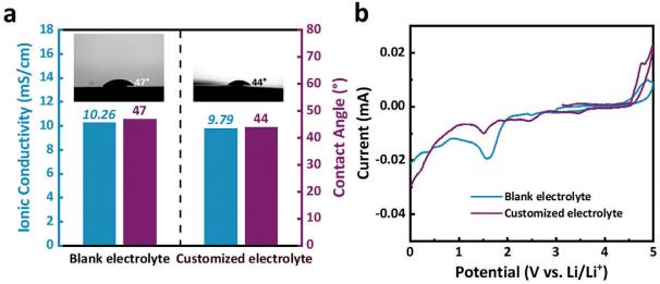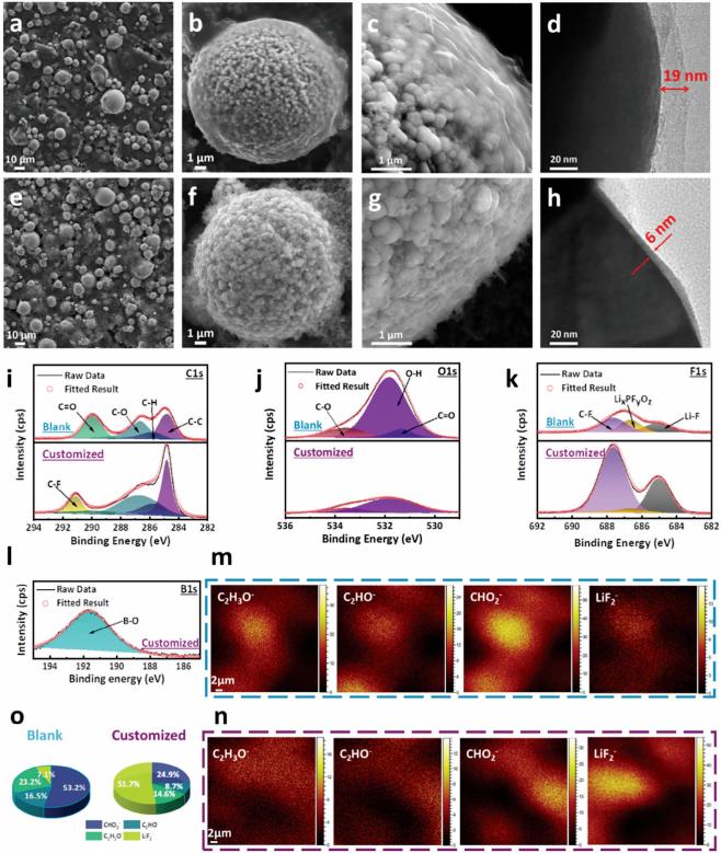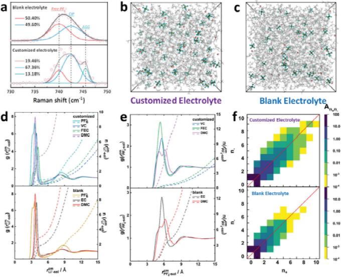 此外,定制电解液的红外光谱和分子动力模拟显示其AGGs的比例更高,这种表面更多的阳离子会分解参与界面面膜的形成,增强无机相(如LiF)的含量,同时降低溶剂化能,导致更快的溶解过程。此外,定制电解液中的阳离子具有更强的溶剂化作用,削弱了与锂离子的融合作用,有利于锂离子的脱溶,也抑制了电极表面有机溶剂的分解。