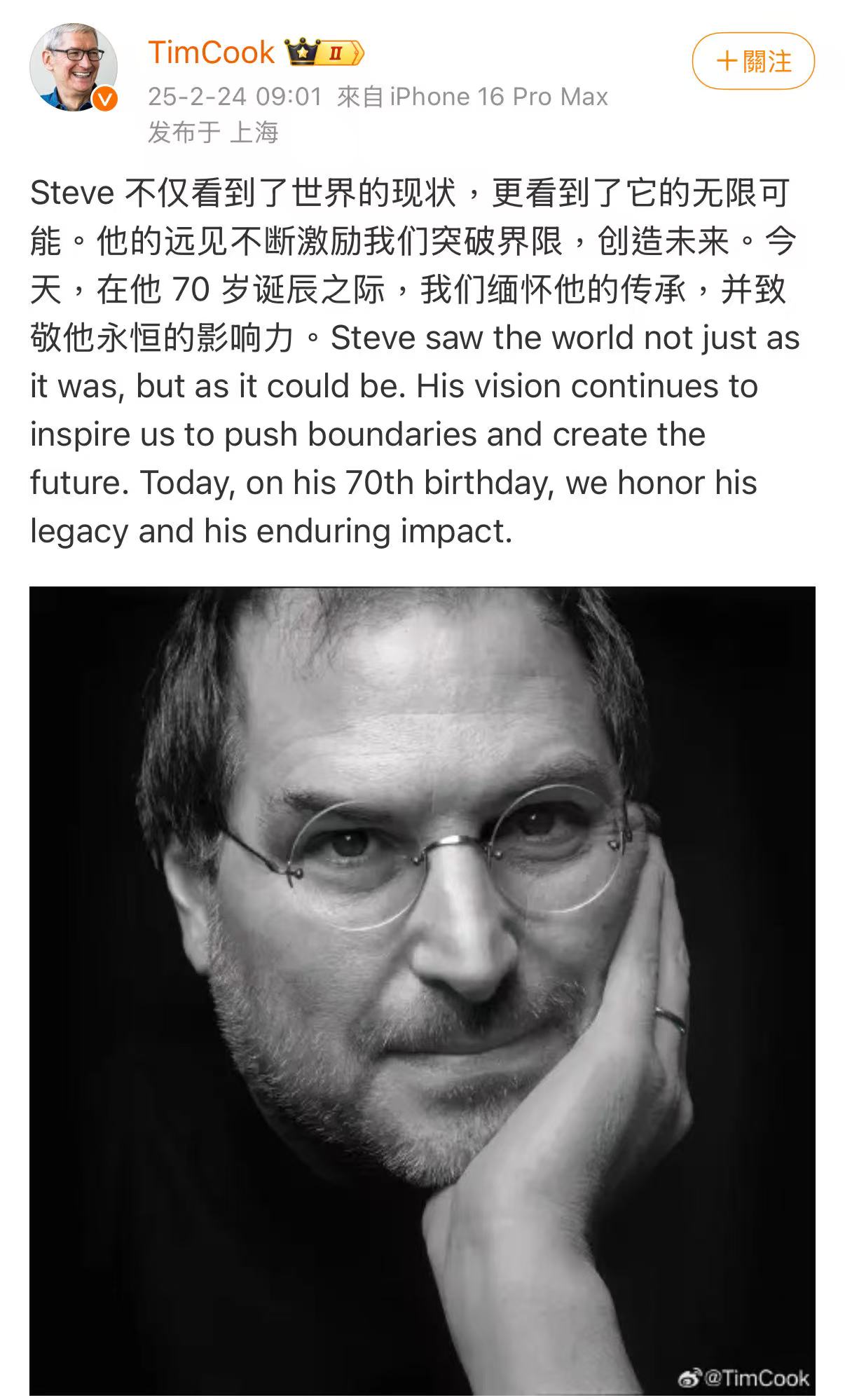 二月二十四日,苹果CEO蒂姆库克在社交平台上发布了纪念乔布斯70岁生日的帖子: