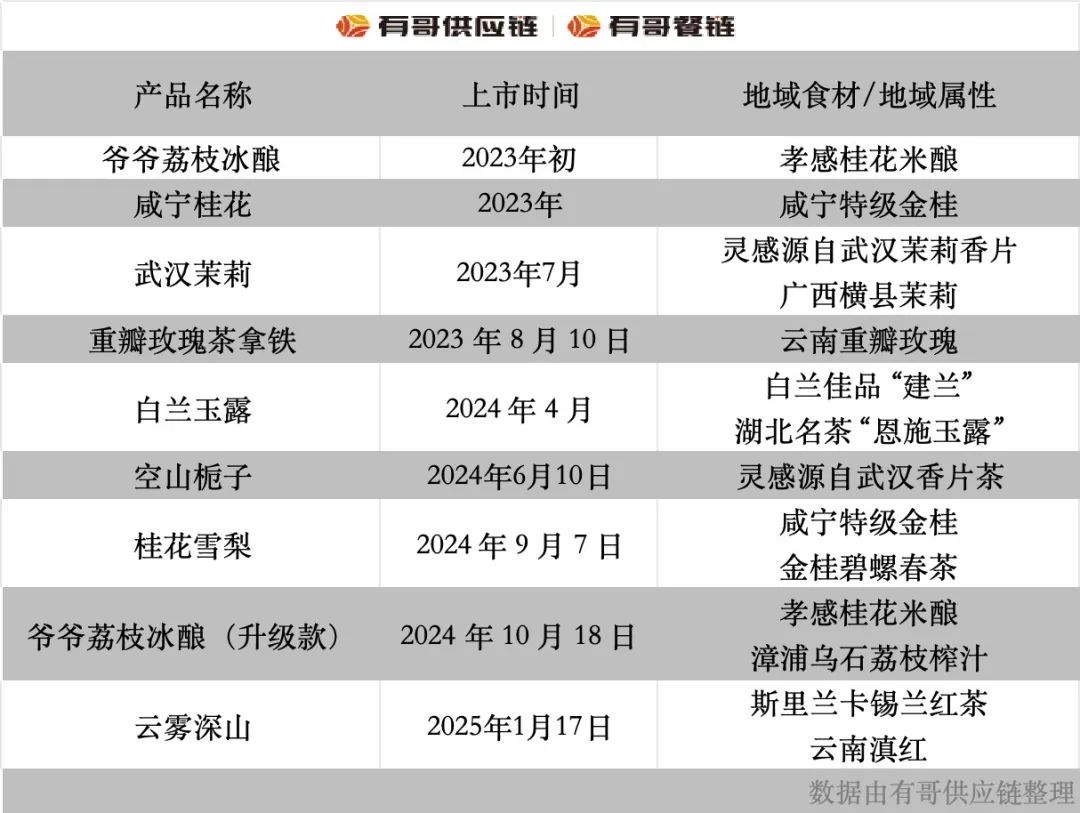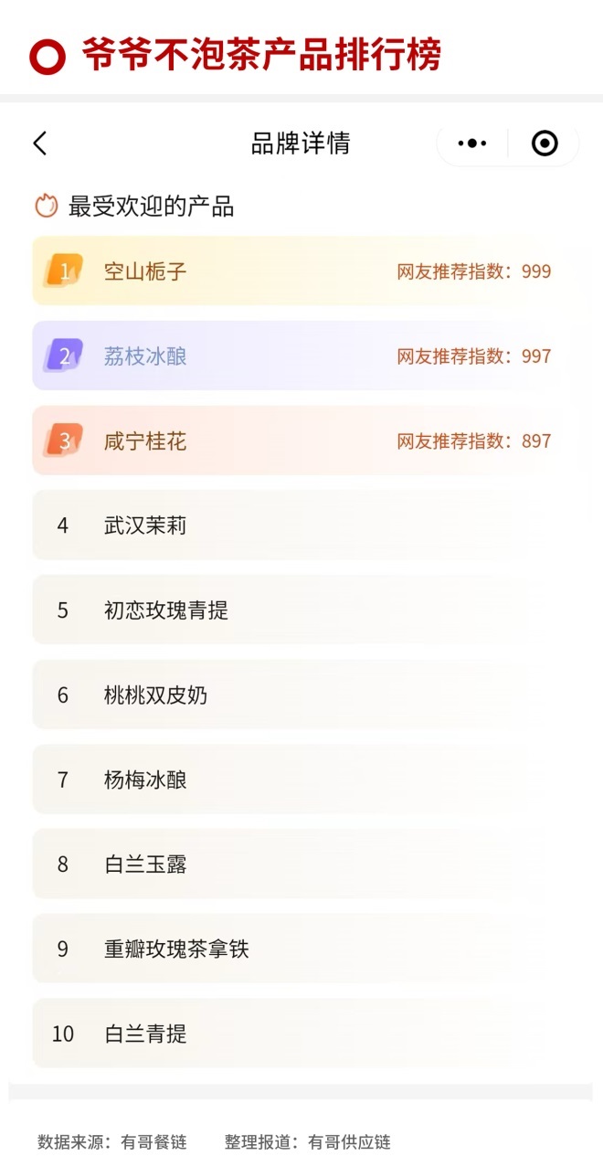 该品牌的转折点始于2022年3月。当时正式更名为“爷爷不泡茶”,定位从“鲜果茶”转变为“东方香茶”。受武汉香片茶的启发,发掘了咸宁桂花、孝感米酿、武汉茉莉等地区特色食材,推出了“爷爷荔枝冰酿”、爆款,如“白兰玉露”,迅速成为武汉旅游打卡的标志。