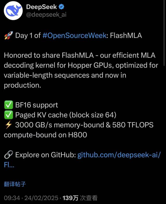 第一天,整整一个 FlashMLA ,这个东西是专门针对英伟达的。 Hoppers GPU ( 例如 H100 、 H800 ),进行效率提升,通俗地说就是提高效率,榨干 GPU 最后一滴性能。