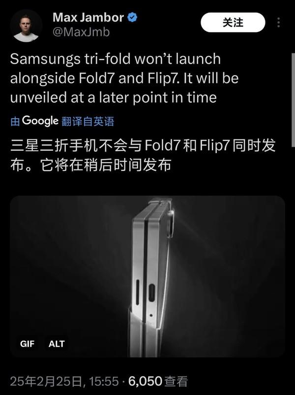 据爆料人士透露 Max Jambor 最新消息,这个被称为“ Galaxy G Fold "设备将不会与之合作 Z Fold7 和 Z Flip7 一起出现,而是将推迟到以后的时间。其在 X 上面透露,虽然三星的三折叠手机目前还没有确定是否会选择“ Galaxy G Fold “这个名字,但是他明确表示,这个装置将不能在三星的第二场比赛中进行。 Unpacked 发布会上与 Z Fold7 和 Z Flip7 一同发布。他还补充说,虽然不会正式发布,但三星可能会在发布会上做一些预告,可能只是几秒钟的商品预告片,供媒体和参与者提前看到他们的风格。