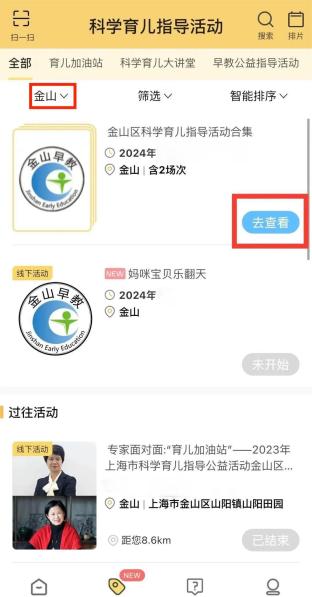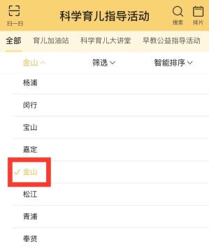 选择“金山”,可以看到金山区各家庭科学育儿指导基地、指导站发布的活动信息。