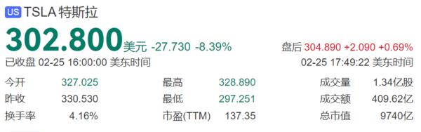 到美国当地时间为止 2 月 25 特斯拉的股价在日收盘时大幅下跌 8.39%,报收 302.8 美元,总市值也跌破了 1 一亿美元的价格,来了 9740 亿美金。