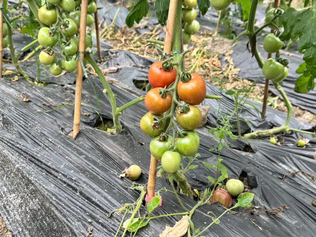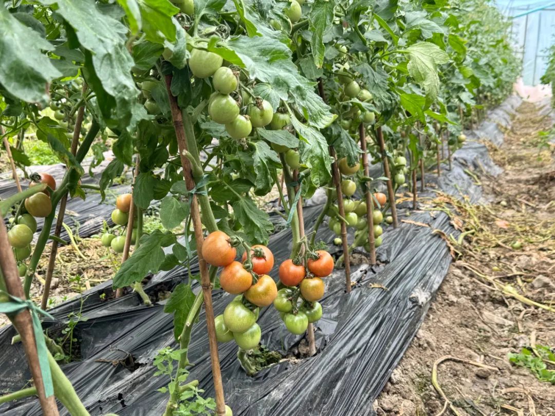走进合作社的种植温室,我看到一排排番茄植物长得茂盛。在一米多高的绿色藤条上,一串串小番茄被树枝覆盖着,果实是红色、黄色或绿色的,都是圆润饱满的,颜色诱人。棚内,几名果农正在锄草、打叶、清理番茄藤杂枝,为即将到来的果实丰收做好充分准备。