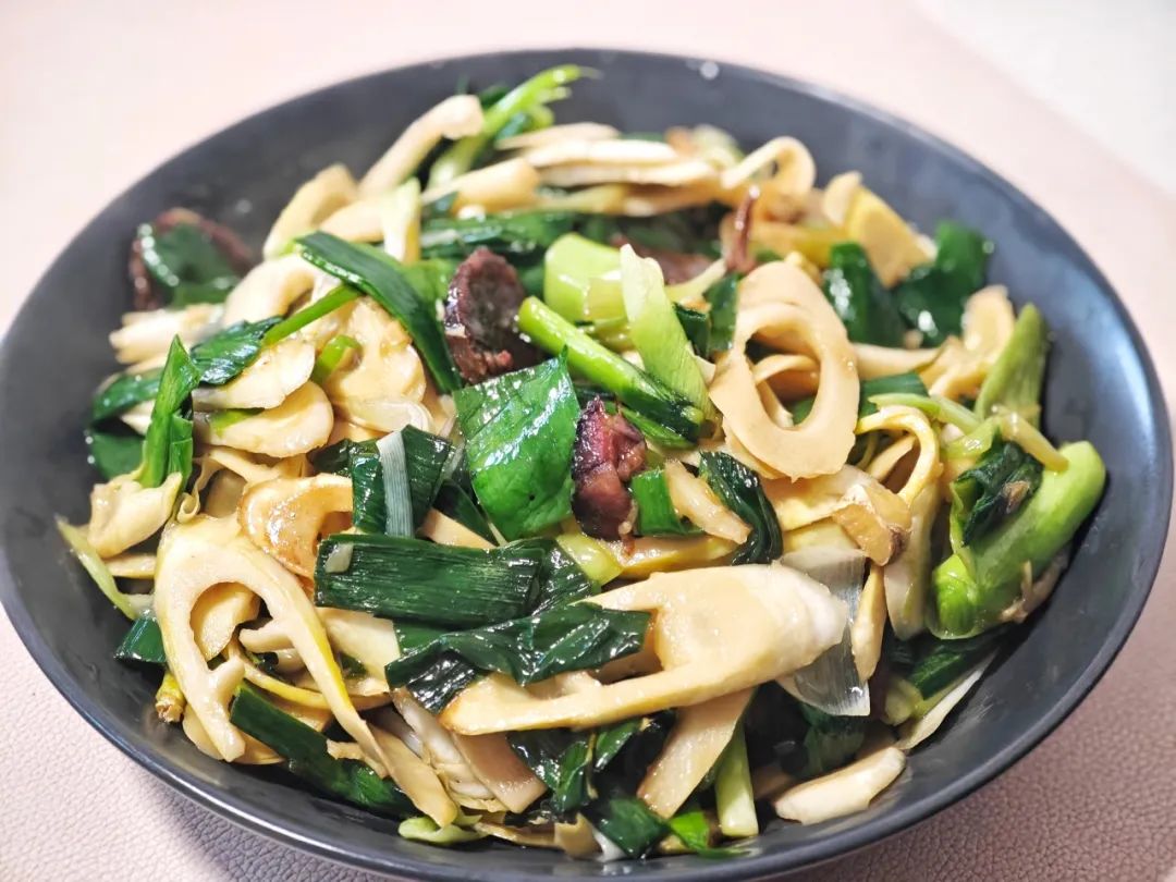 第二道菜,四季放入盘中,酱肉、葱、蒜爆香,放入竹笋中翻炒,出锅前撒上一大把青蒜,一根香喷喷的竹笋炒酱肉就出锅了。