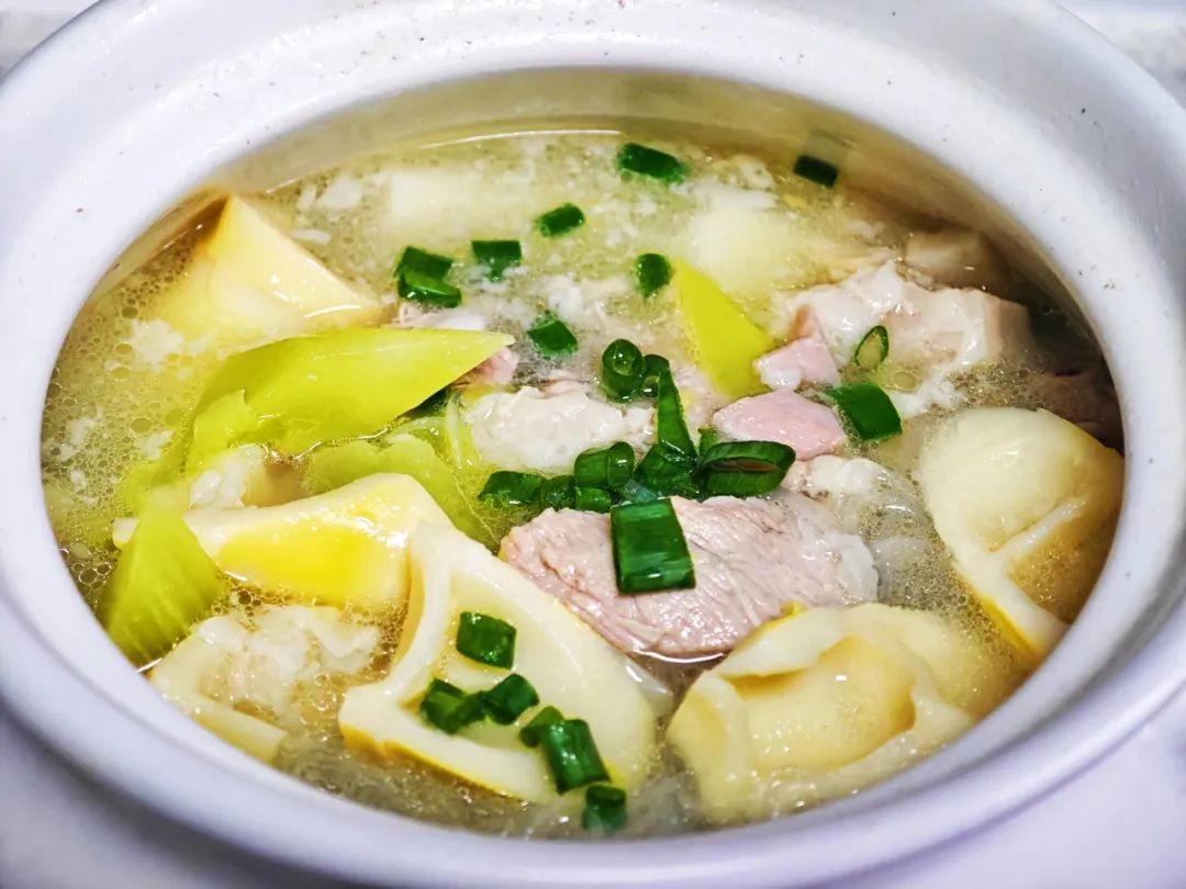 第一个是上海的名菜——腌制新鲜。新鲜排骨和腌制的咸肉,葱姜料酒焯水,放在砂锅里,小火煮至软烂。同时,准备竹笋、百叶结、青笋等食材分批放入,出锅前撒少量葱花。锅里还是“坚定”的,舀一口。世界上最美味的恐怕就是这种食材结合撞击形成的美感,暖心养胃。