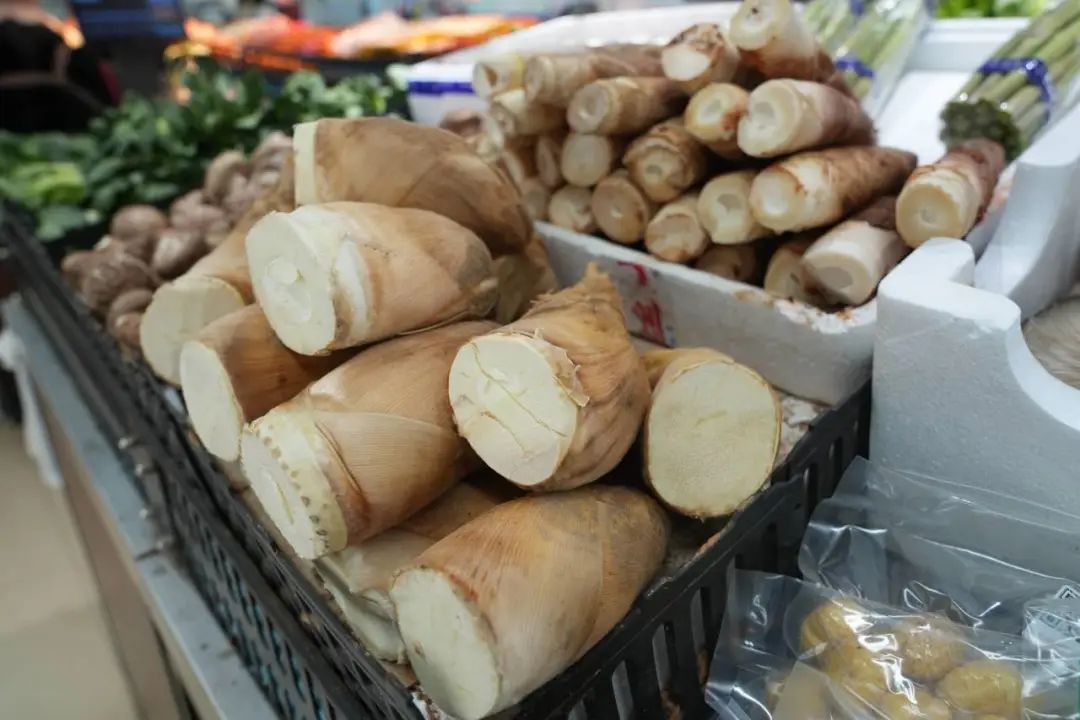 在市场上,新鲜的竹笋整齐地摆放在摊位上,白色的竹笋肉包裹在嫩黄色的竹笋外套中,散发出淡淡的香味。据摊主介绍,现在的竹笋会比较嫩,炒菜煮汤都很好吃。今年竹笋的价格基本和往年持平,没有大的起伏。竹笋的常见做法有很多,这里推荐两种。